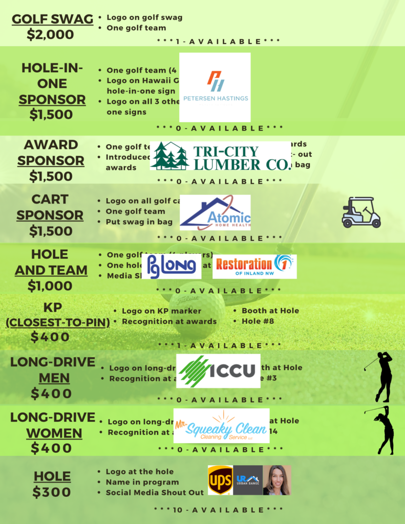 Whether you join us with a team of 4, sponsor a hole for $300, or decide to be our premier Sponsor for $8,000. You can rest assured that all proceeds from this event will go towards helping the families we serve right here in Tri-Cities.